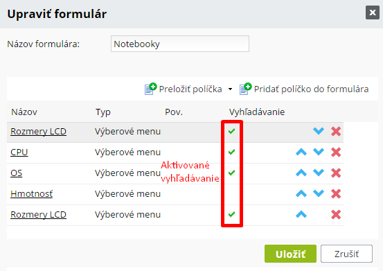Prehľad o tom, ktoré políčko ste nastavili ako vyhľadávateľné nájdete, ak si rozkliknete formulár doplnkových polí (okno "Upraviť formulár"). Pri aktivovanom vyhľadávaní je značka: