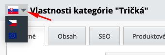 V okne Vlastnosti kategórie je pri prepojených stránkach možné rýchlo prechádzať medzi jazykovými verziami. Stačí kliknúť na vlajku a zobrazí sa zoznam, ktorý vám umožní prepnúť sa na vlastnosti prepojenej kategórie v jazykovej verzii: