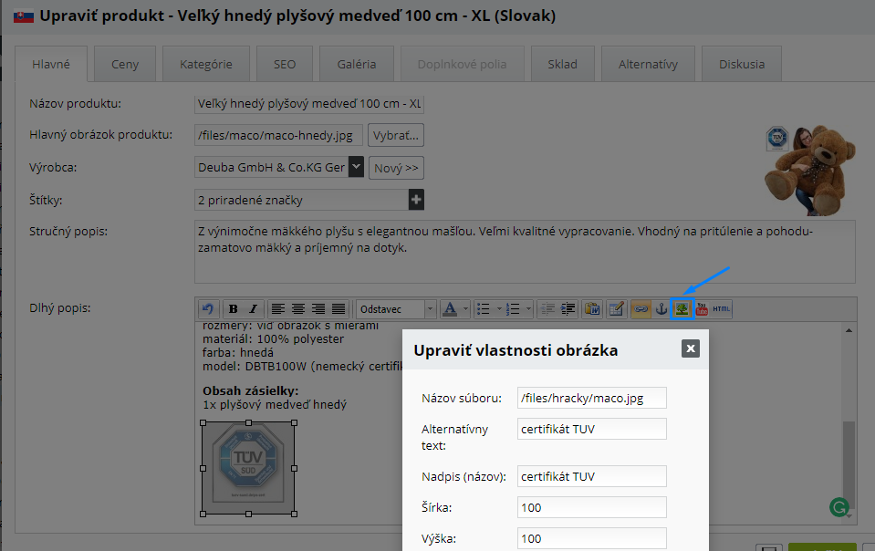 Alternatívny text hlavného obrázka a atribút title systém generuje za vás automaticky z názvu vášho produktu:
