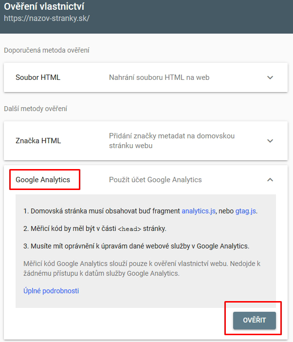TIP pre weby a eshopy na BiznisWeb.sk: Ak už máte svoju stránku prepojenú s Google Analytics, nemusíte ručne overovať stránky v Google Search Console. Stačí vybrať v "Overenie vlastníctva" Google Analytics a následne kliknúť na OVERIŤ. Overenie prebehne automaticky. Podrobnejší návod na overenie vlastníctva stránok v Google Search Console: