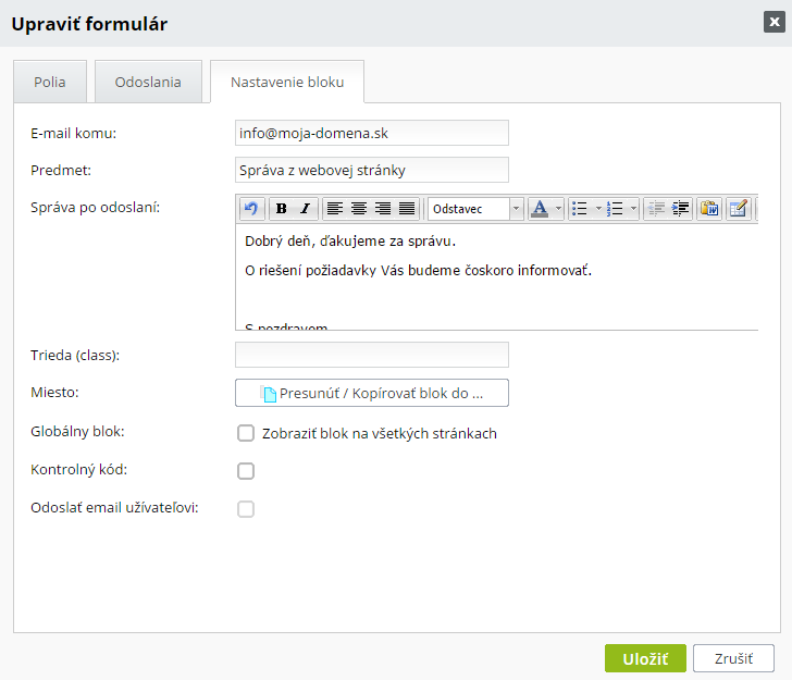 Blok formulár, takisto ako aj ostatné bloky, môžete v Nastaveniach Bloku presunúť alebo kopírovať na inú stránku, prípadne nastaviť ho tak, aby sa zobrazoval na všetkých stránkach webu.