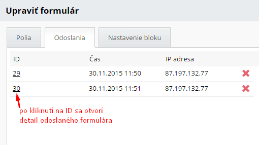 Súčasťou bloku Formulár je aj archív odoslaných formulárov v záložke Odoslania. Počet formulárov v archíve môžete upraviť vymazaním nežiaduceho formulára.