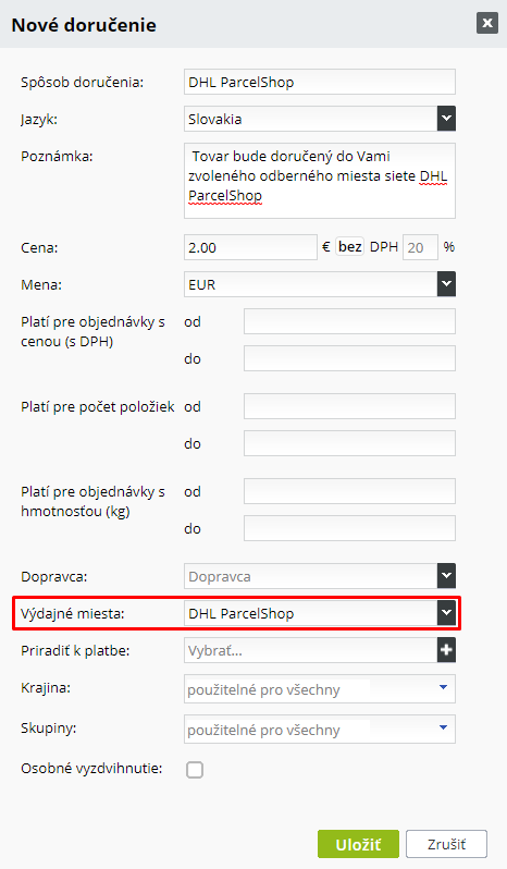 V kolonke VÝDAJNÉ MIESTA vyberte DHL ParcelShop a uložte.